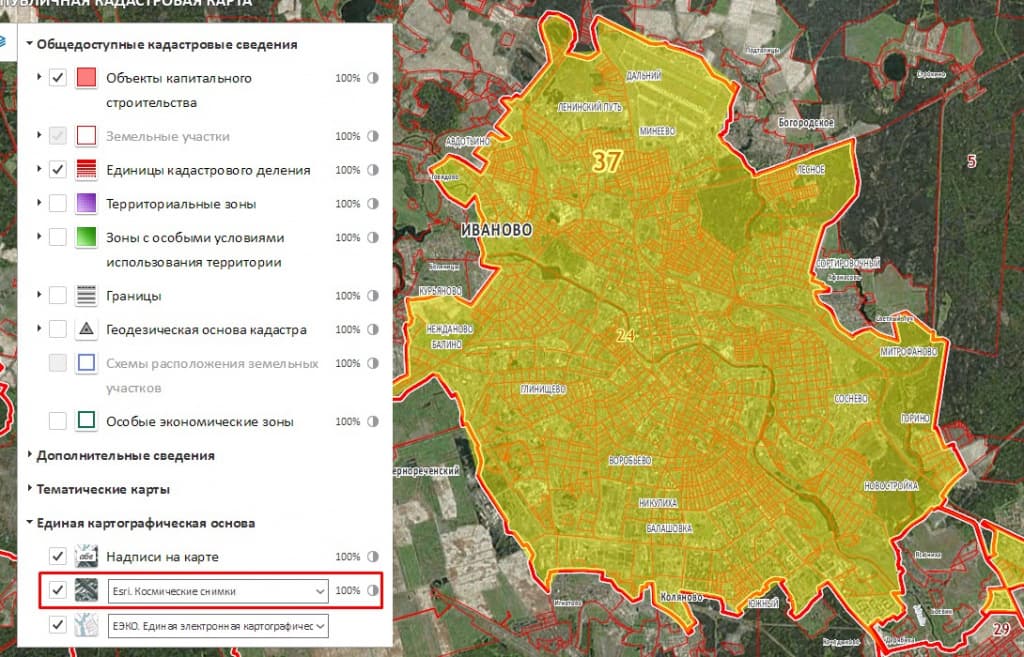 Для Иваново все кадастровые номера начинаются на 37:24, вводим эти цифры в строку поиска, затем переводим карту в космические снимки через панель "Управление картой" и поставив галочку почти в самом низу на "Космические снимки". Дальше ищем свой участок, можно параллельно открыть Яндекс или Гугл карты, для лучшего ориентира.