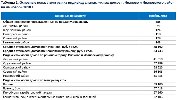 В ноябре 2018 года средневзвешенная стоимость одного квадратного метра жилых домов в г. Иваново составила 38 192 рублей, в Ивановском районе 33 733 рублей. Самые дорогие дома расположены в Ленинском районе города (возможно это связано с ограниченным предложением). В среднем по городу стоимость домов находится в одном диапазоне. По материалу стен самые дорогими являются кирпичные дома, а самыми дешевыми дома из пеноблоков, газобетона.